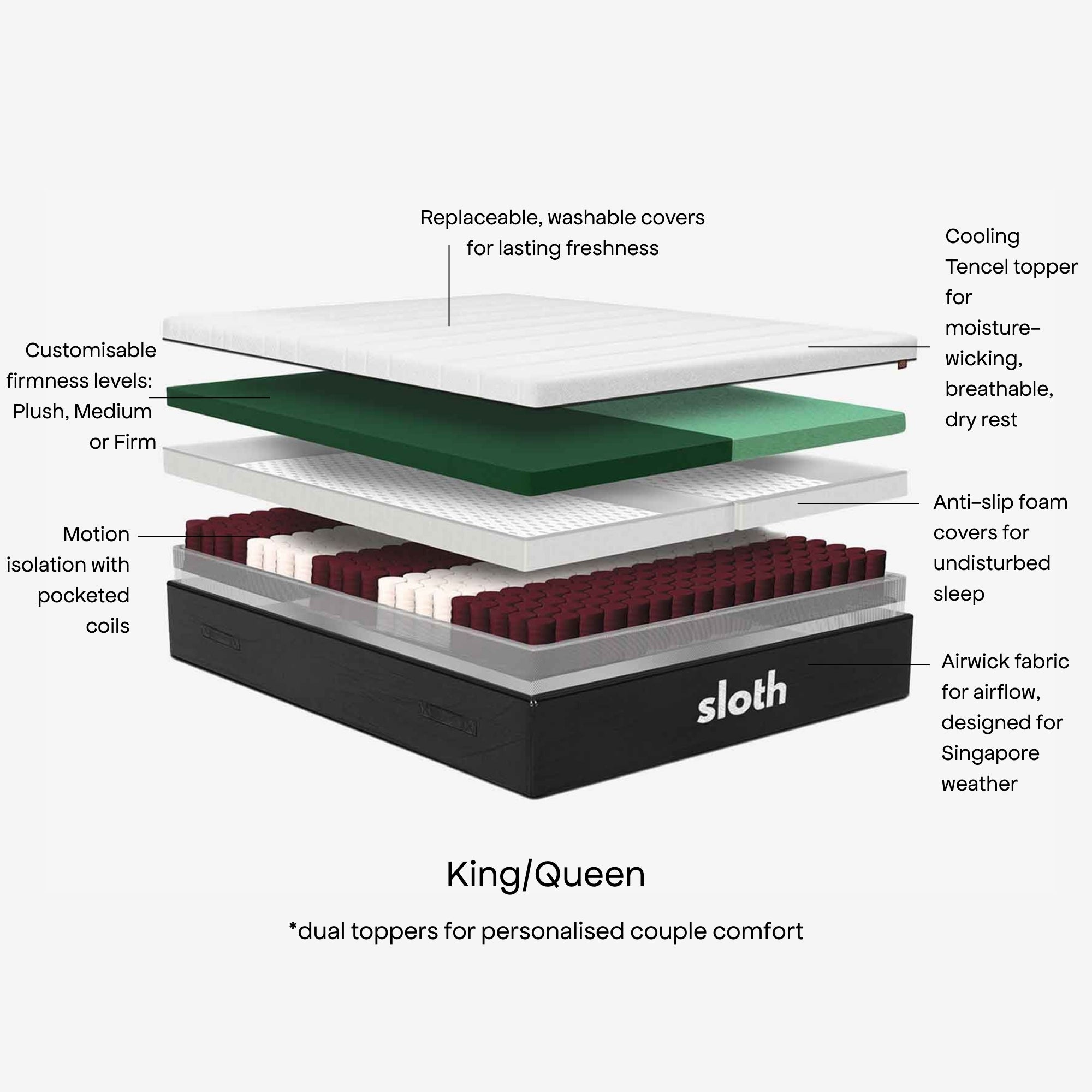 Experience tailored comfort with the SLOTH Mattress, featuring a dual topper design for customizable firmness. With motion-isolating pocketed coils and a breathable tencel cover, it ensures cool, undisturbed sleep - perfect for Singapore’s warm, humid nights.