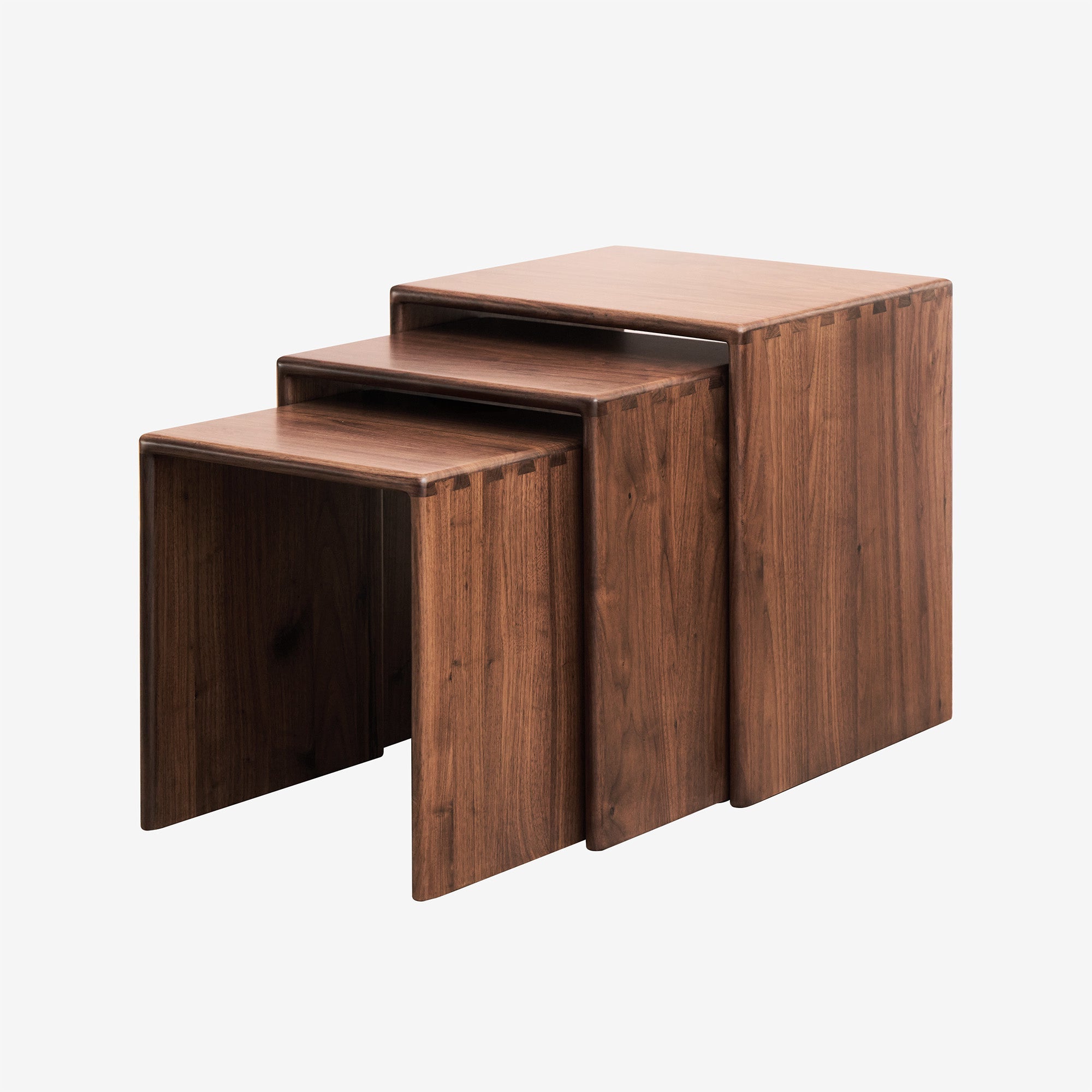 Elevate your space with three tiered tables crafted from solid American Black Walnut. Compact yet versatile, they nest or expand easily and work as coffee tables, side tables, stools, or entryway seating. The Preston Nesting Set includes Large, Medium, and Small pieces in one bundle.