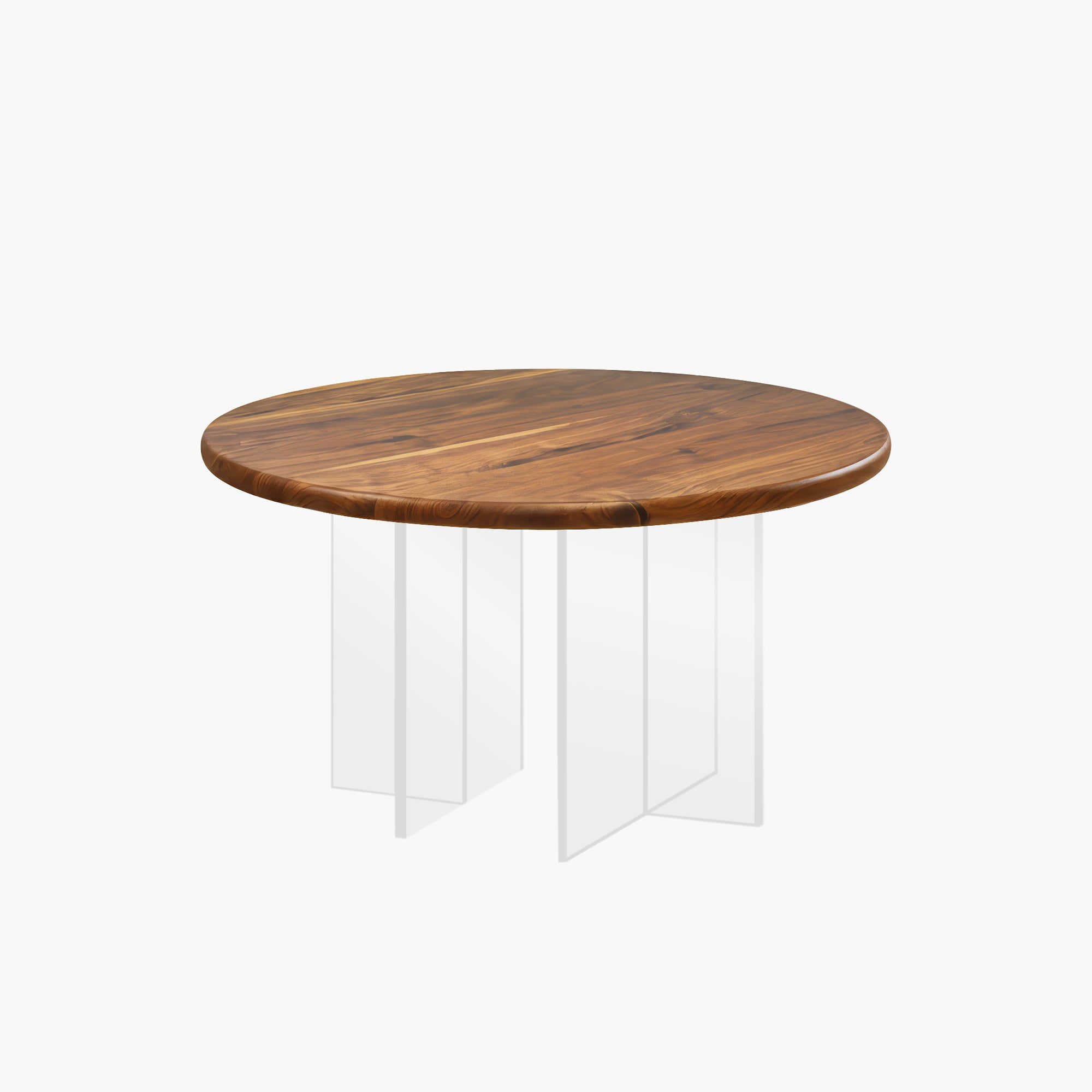 Artisan-crafted from 6–8 solid American Black Walnut slabs, the Lumi Round Dining Table rests a beautifully curved hexo top on clear Acrylic Legs — a refine balance of natural wood warmth and modern design.