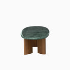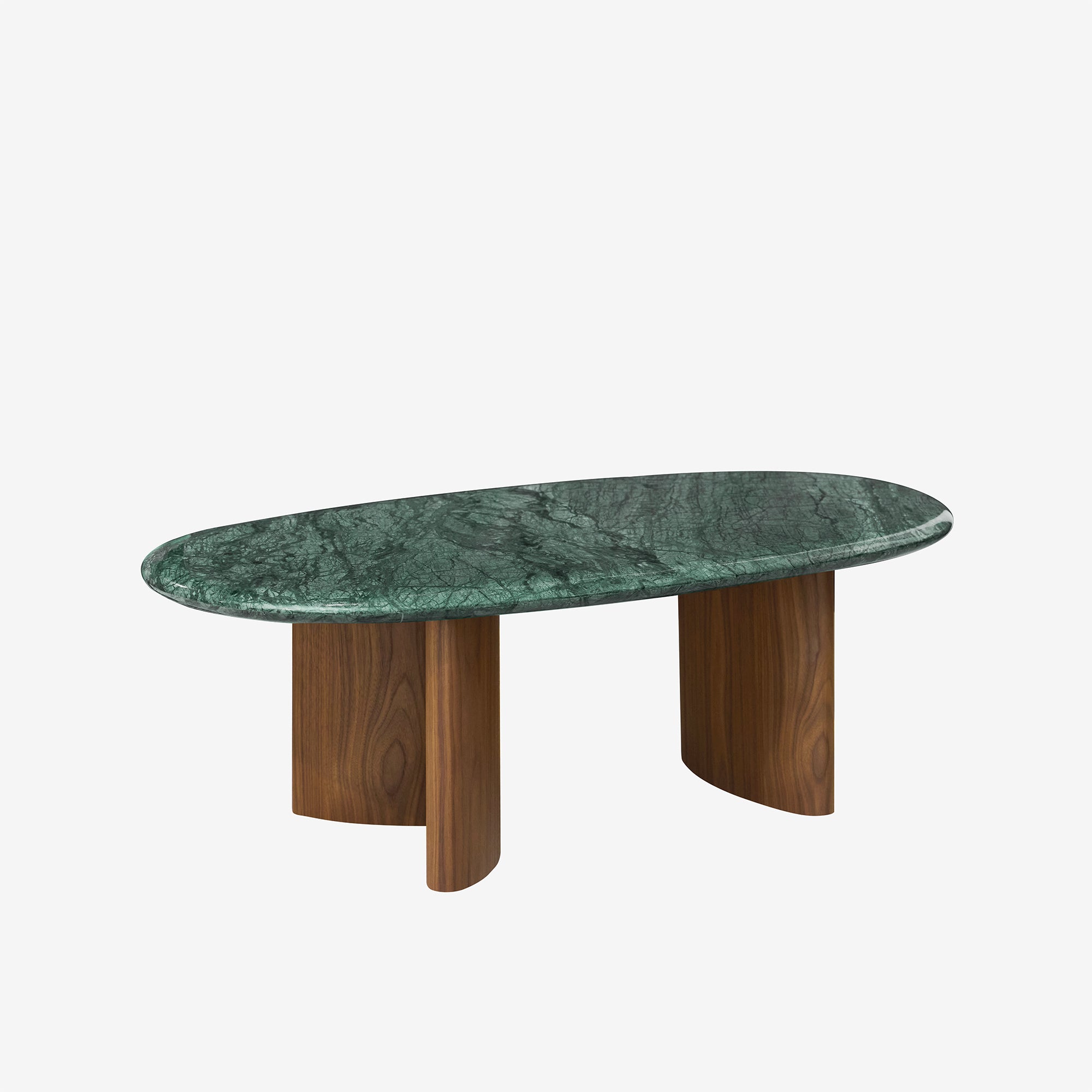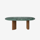 A rich green Udaipur Marble piece rests atop gently curved dark walnut veneer legs in the Tinos Coffee Table. Its sculptural silhouette and natural marble veining create a captivating centrepiece, bringing depth, texture, and refined luxury to any living space.