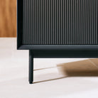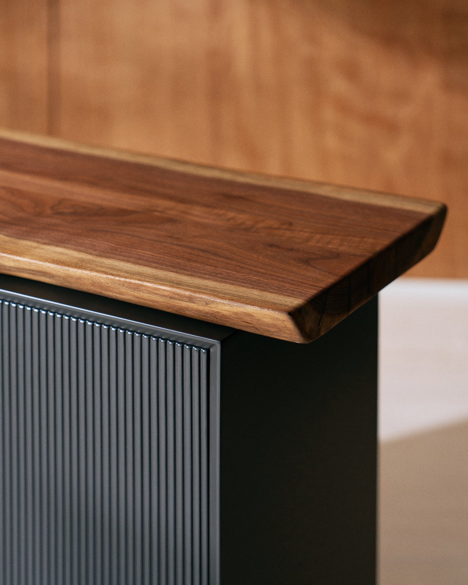 Deep charcoal lacquer and black steel legs meet bevelled, handle-free doors in quiet modern design. A live-edged American Black Walnut solid wood top crowns the piece, offering a gentle touch of nature and understated warmth to any room.