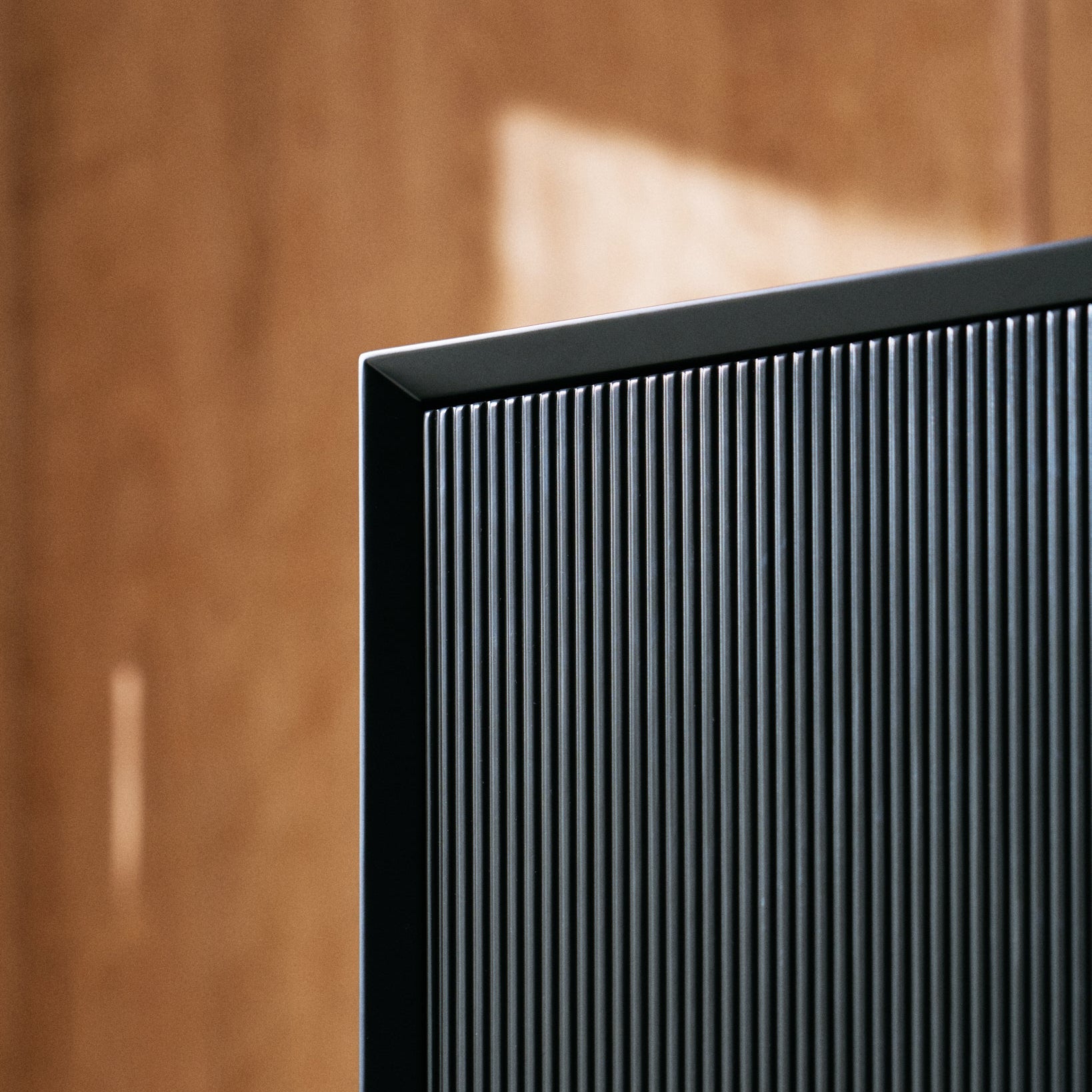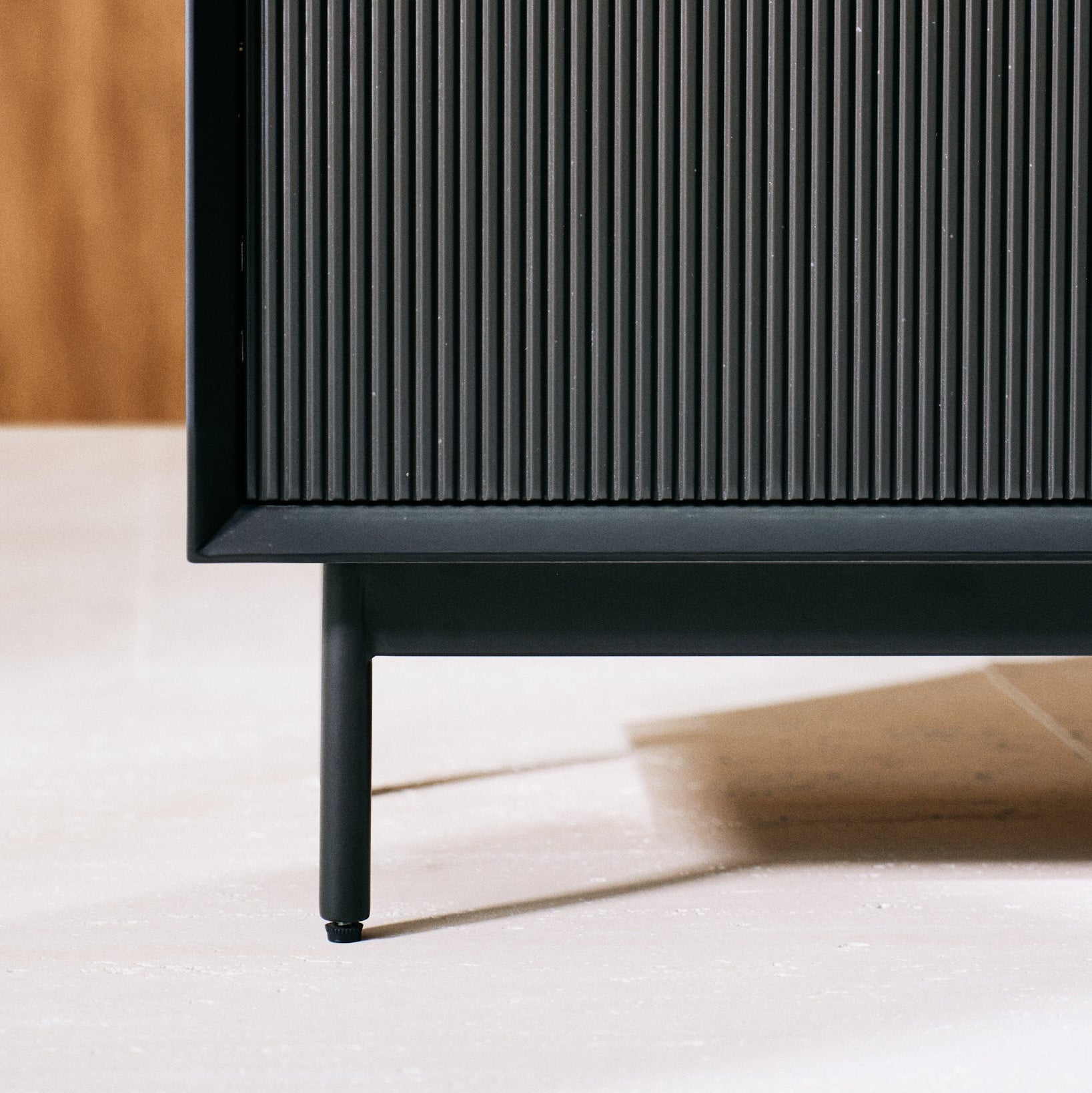 A sleek charcoal grey lacquer finish with black steel legs forms a modern base, complemented by an optional wood slab top. Bevelled edges and a push-click drawer highlight its minimalist design—perfect for balancing storage in compact spaces with a refined, contemporary touch.