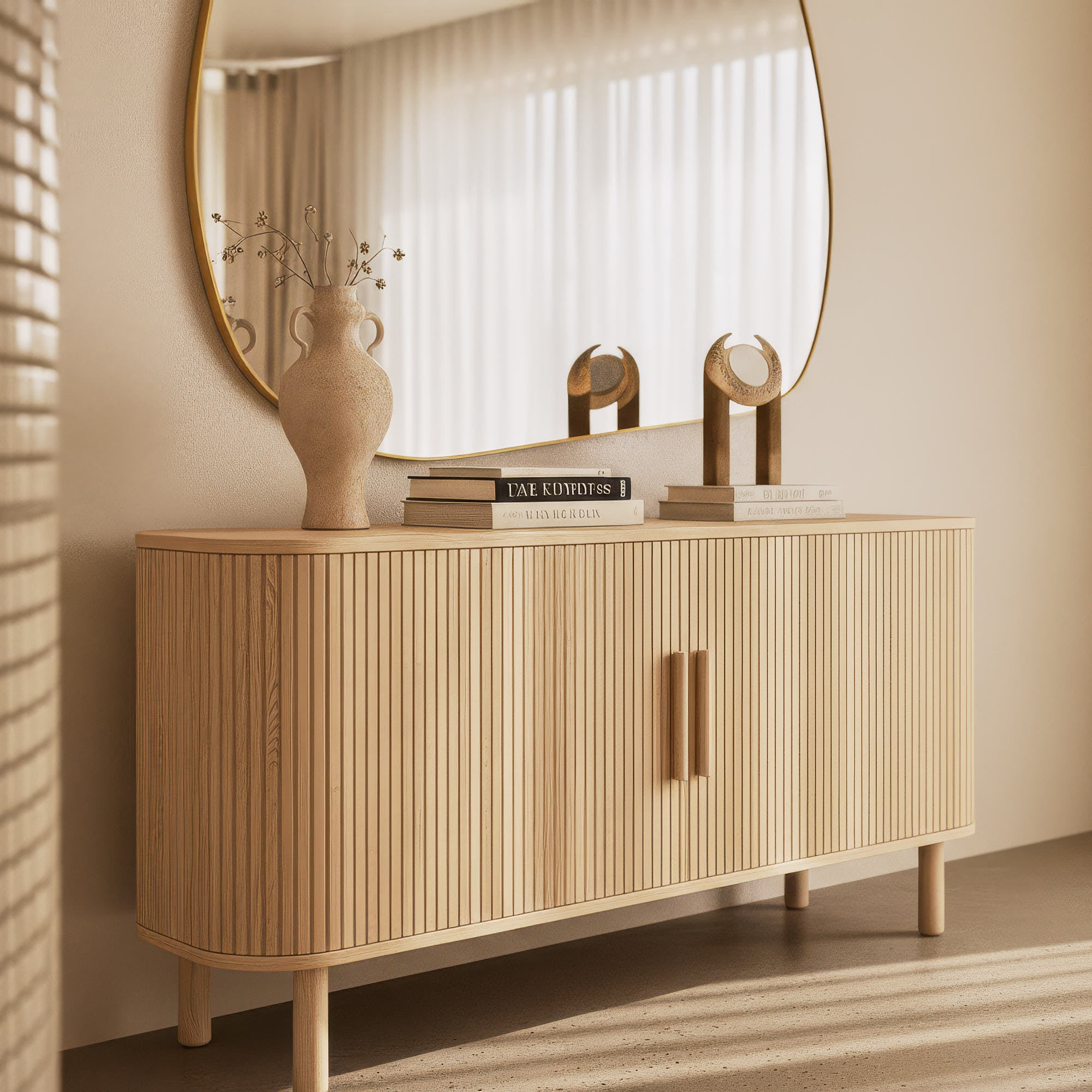 The Havana Cabinet features a full-wood frame with rounded legs and sliding doors for a clean, composed look. Its natural grain adds warmth to any space — designed for those who appreciate quiet confidence and minimal, thoughtful design.