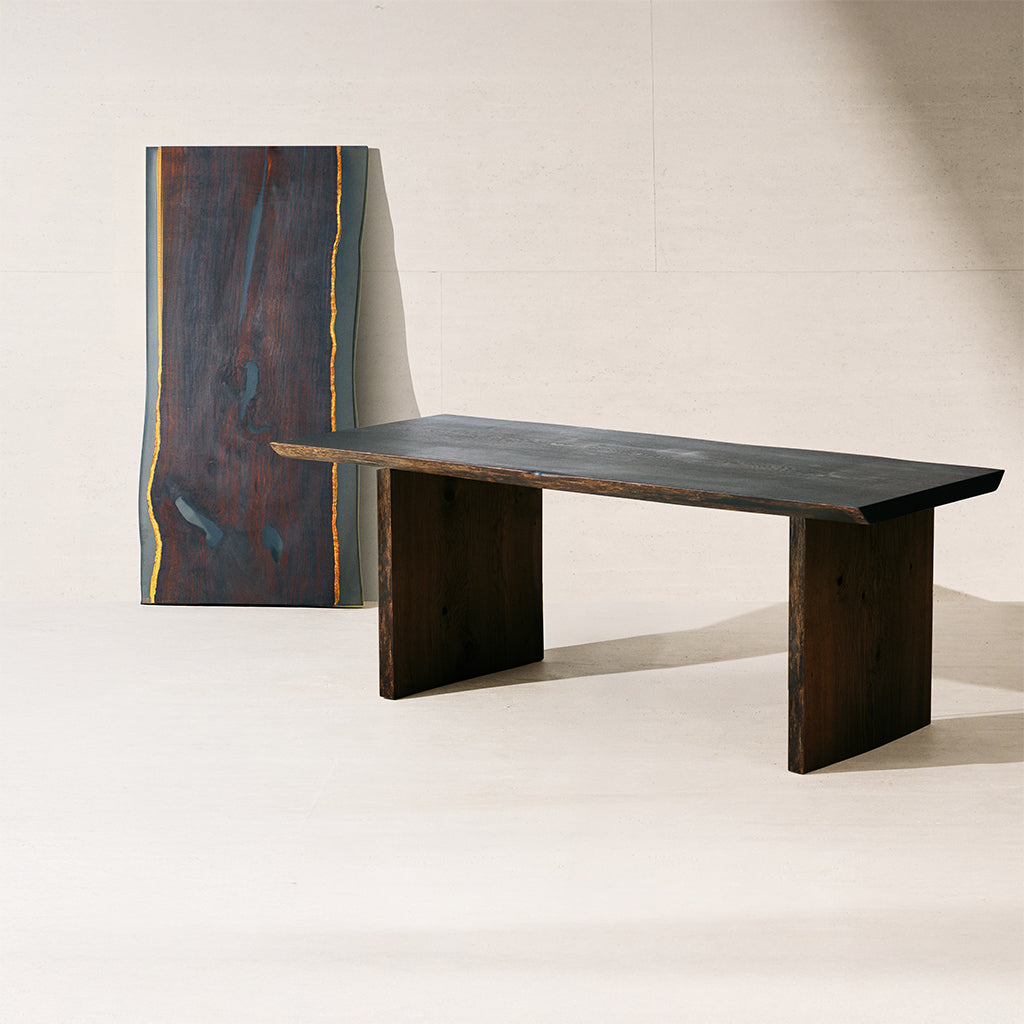 A final coat of Rubio Monocoat Oil deepens its rich chocolate and charcoal hues while protecting the wood, ensuring lasting beauty and resilience for everyday use.