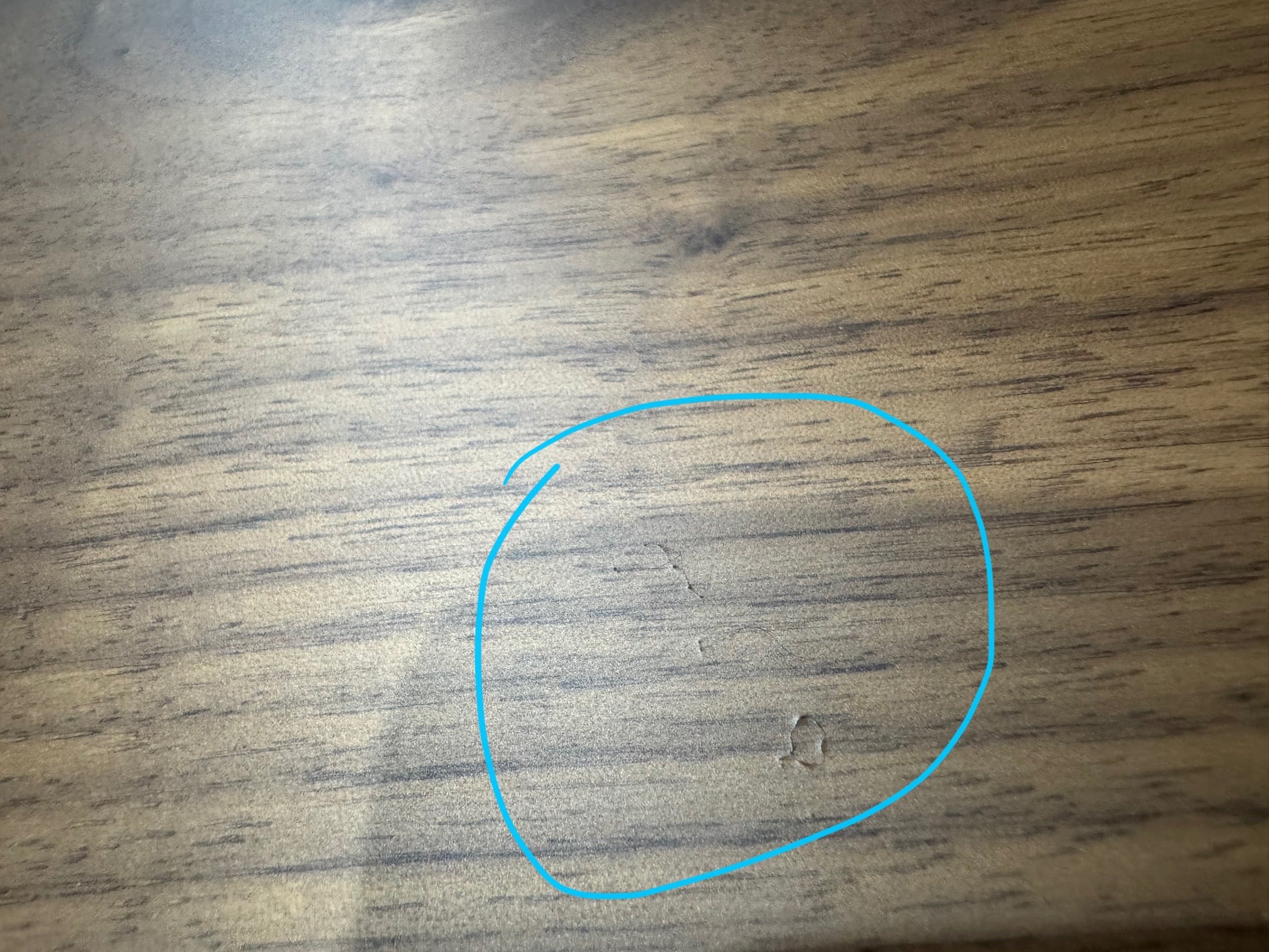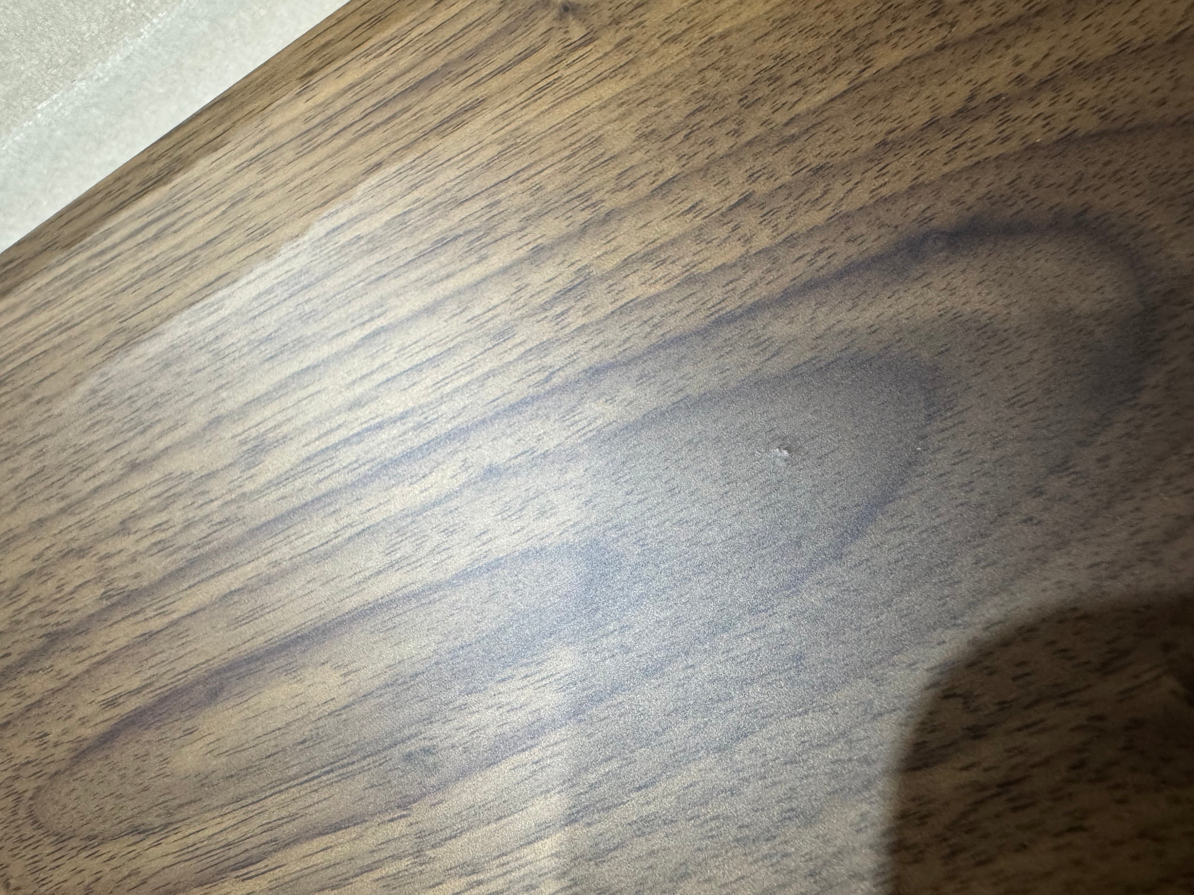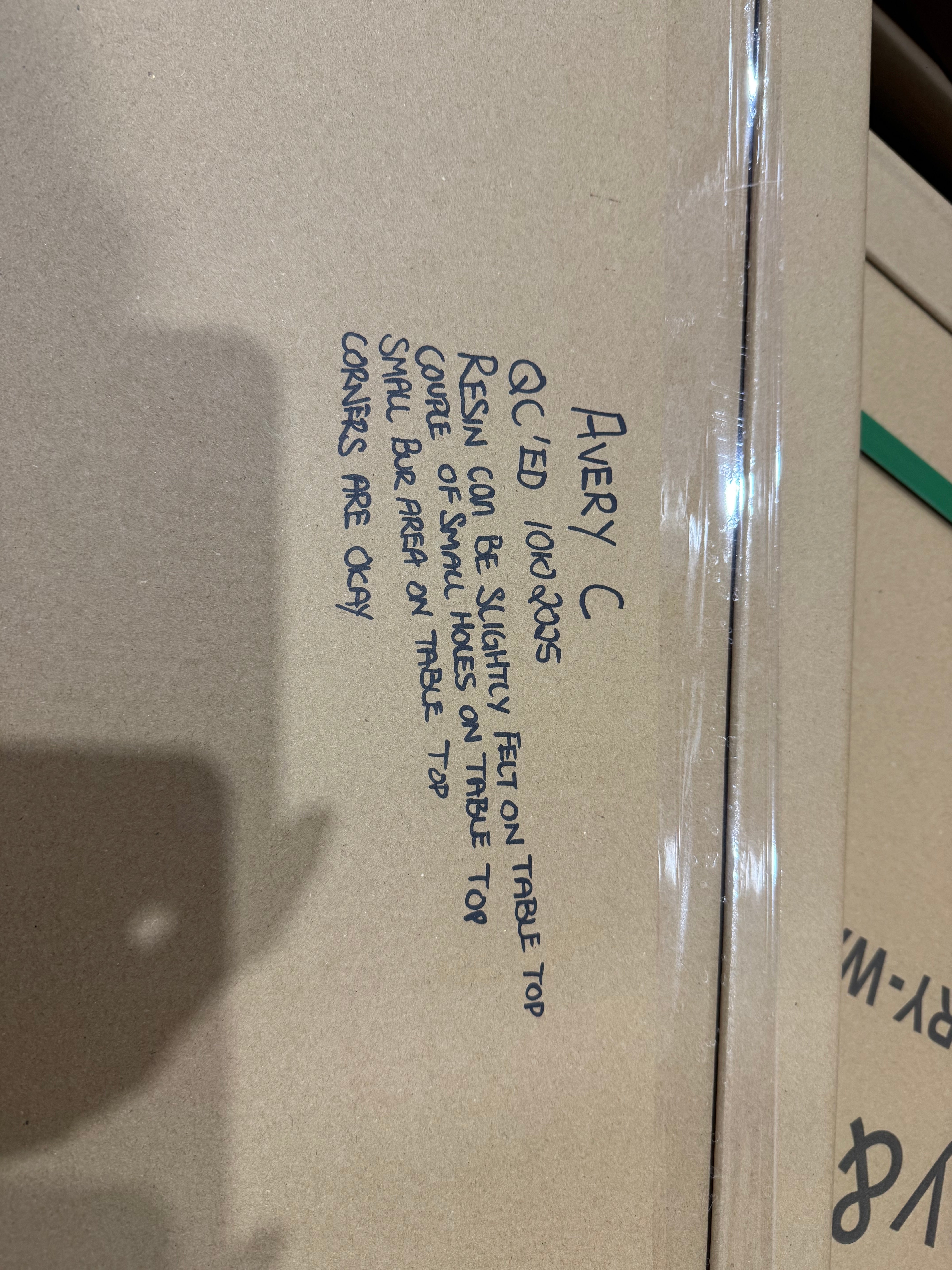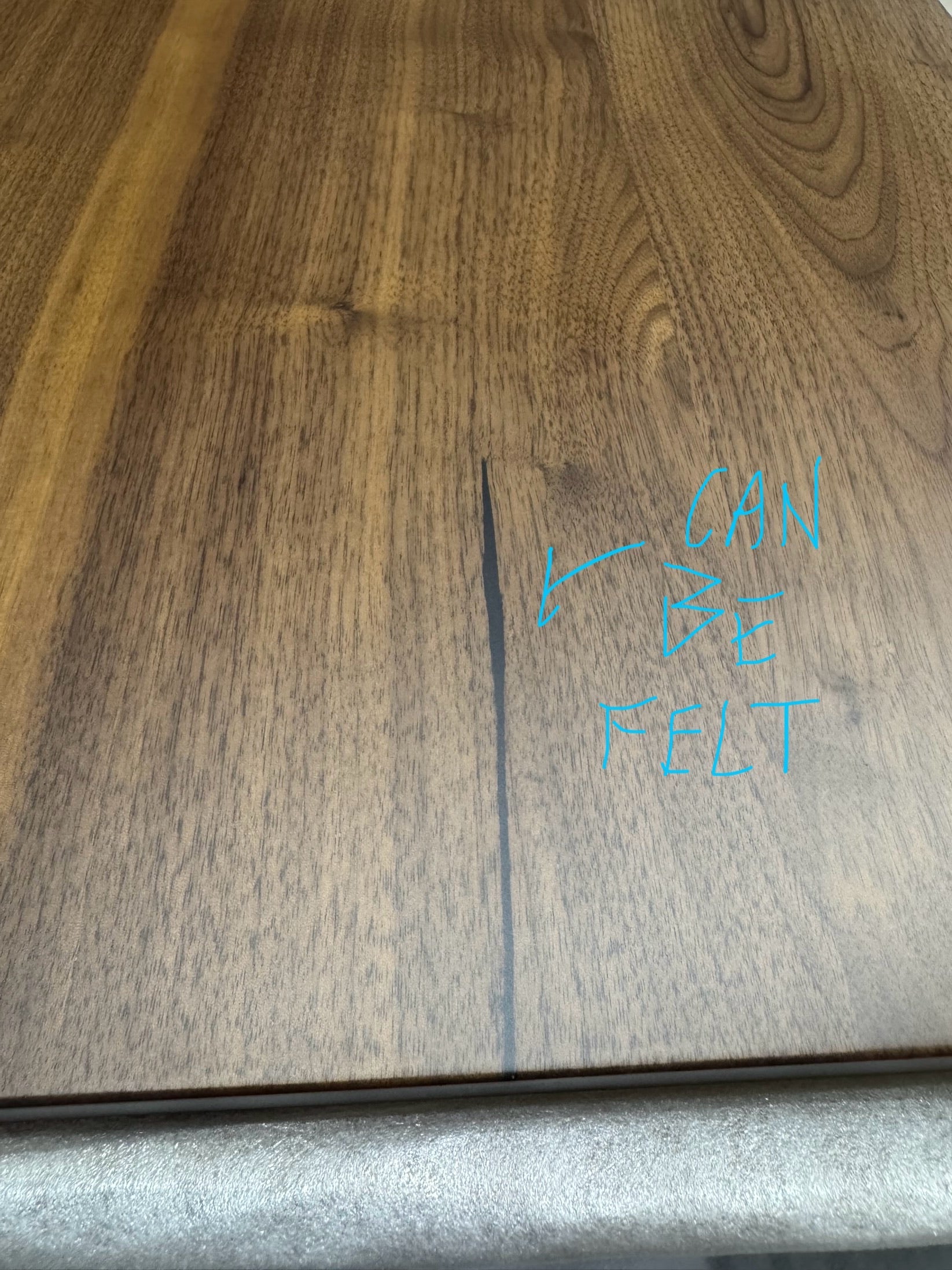 Table top has multiple small holes due to bubbles formed during the resin setting process, there is a small area with what looks like a bur on the table top.